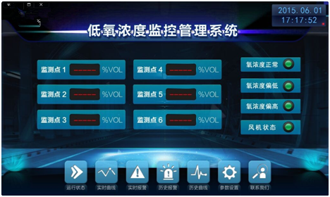 直接點擊-低氧濃度監(jiān)控管路系統(tǒng)-按鈕進如;該界面 上可查看到系統(tǒng)運行實際狀態(tài)并儲存、打印報警記錄。
